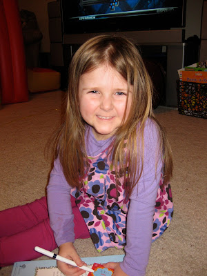 Halle was really into Valentine's day and making valentines for her friends. I had every intention of helping her make homemade cards, but we didn't get around to that, just like we didn't get around to making the princess cookies that she wanted to make. She wrote her name on her Ni Hao Kai Lan and Princess and the Frog Valentines. She also put together gift bags for her cousins and her friends at gymnastics and ballet.